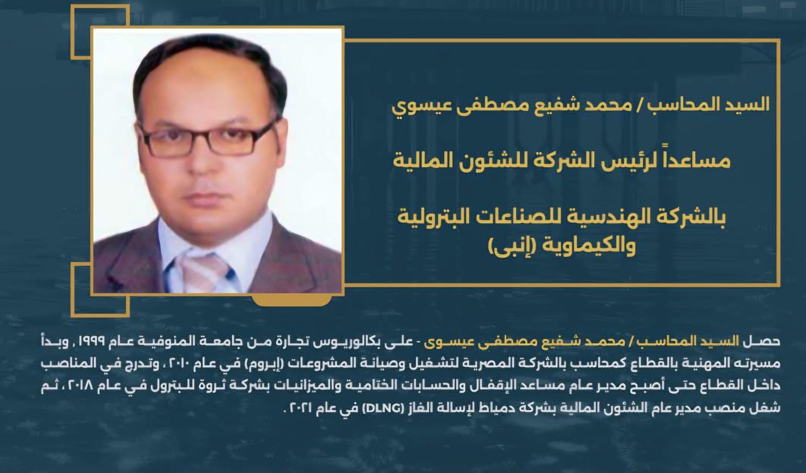 في إطار خطة وزارة البترول والثروة المعدنية لتعزيز الكفاءات المالية داخل شركات القطاع ودعم القيادات التنفيذية، تم اعتماد تكليف المحاسب محمد شفيع مصطفى عيسوي للعمل في منصب مساعد رئيس الشركة الهندسية للصناعات البترولية والكيماوية «إنبي» للشئون المالية.