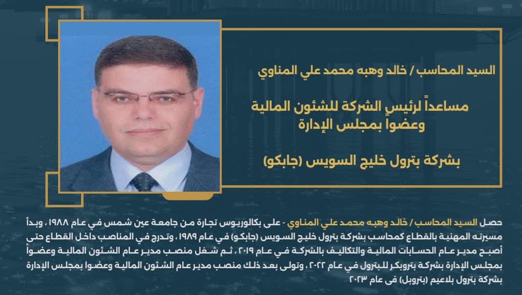 اعتمدت وزارة البترول والثروة المعدنية تكليف المحاسب خالد وهبة محمد علي المناوي بمنصب مساعد رئيس الشركة للشئون المالية وعضو مجلس الإدارة بشركة بترول خليج السويس «جابكو»، وذلك ضمن حركة تطوير القيادات المالية التي تتبناها الوزارة لتعزيز كفاءة الأداء ودعم منظومة الحوكمة داخل شركات القطاع.